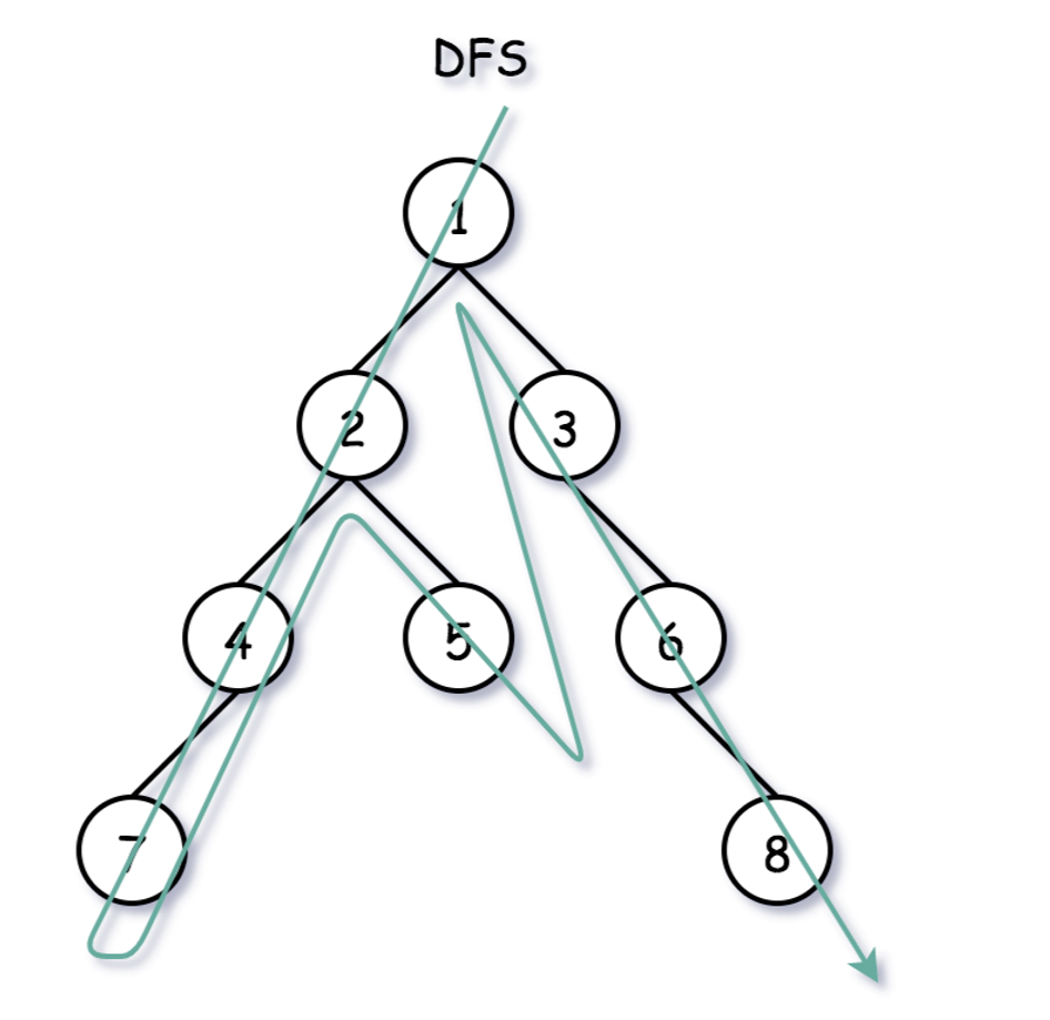 : 그래프의 시작 노드에서 출발하여 탐색할 한 쪽 분기를 정하여 최대 깊이까지 탐색을 마친 후 다른 쪽 분기로 이동하여 다시 탐색을 수행하는 알고리즘
