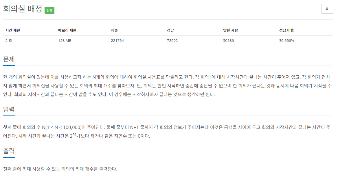 3. 정렬된 회의 시간 목록을 순회하며, 이전 회의의 종료 시간 이후에 시작하는 회의만 선택한다.