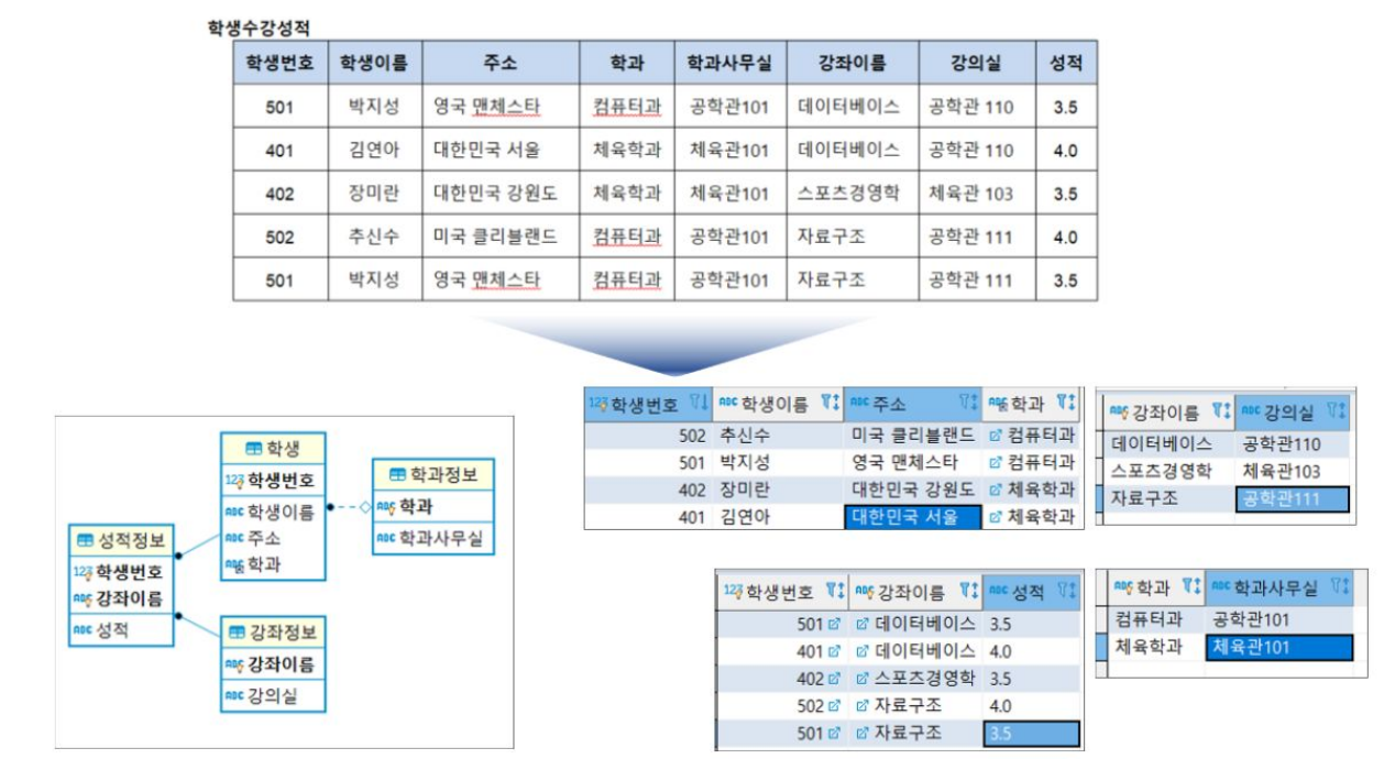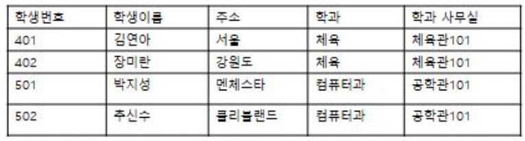 - ex) 학생 501번 박지성의 주소를 맨체스터에서 서울로 변경하려고 할 때, 여러 테이블에 중복된 정보가 있으면 모든 정보를 일관되게 수정해야 함.
